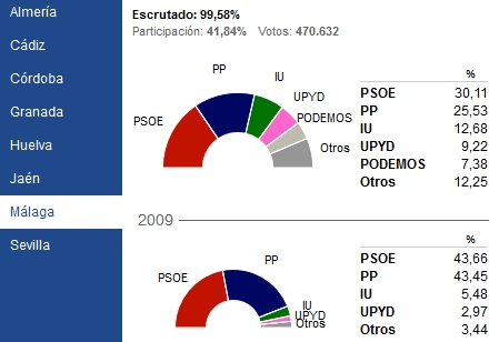 Partiet kommer uventet ind før det liberale Unión Progreso y Democracia (UpyD), som vandt fire pladser - en mere end i 2009 - hvilket er en stor personlig sejr for partileder Rosa Díez, som ikke gik glip af chancen for at påpege, at Spaniens mangeårige topartiregime nu er på vej ud, og at landets to store partier, PSOE og PP, sammen er gået tilbage fra at vinde 80 procent af landets stemmer, til blot 49 procent.