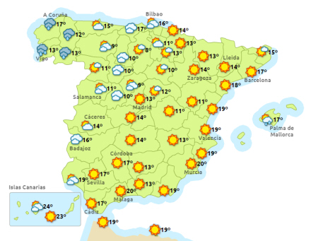 Valencia har haft en morgen med få skyer, men fra middagstid og helt frem til solen går ned, kan byen nyde solen ganske uforstyrret. Temperaturen bliver noget højere end midt i landet med sine 9 til 21 grader.