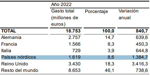 I de første fire måneder af 2022 er briterne dem, der har lagt flest penge i Spanien (18,3 procent). Derefter følger Tyskland (14,7 procent) og herefter følger os fra de nordiske lande med en fremgang på 8,6 procent: