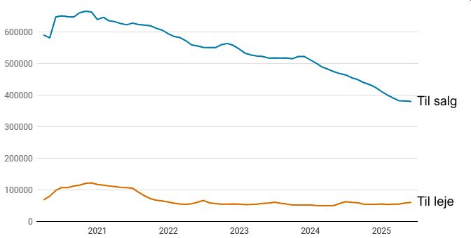 Boligudbuddet til salg falder med næsten 20 procent på et år, mens lejemarkedet begynder at stige.