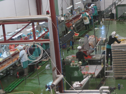 Afhængig af årstiden fremstilles forskellige produkter. Under vores besøg var det forarbejdning og konservering af de små røde peberfrugter 'Pimientos del Piquillo'.