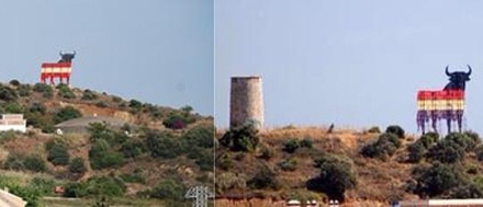 Vi taler om strukturen af den kendte Osborne-tyr, der står på en bakketop i Torreblanca i Fuengirola, som lørdag morgen var malet over med de republikanske farver; rød, gul og lilla.