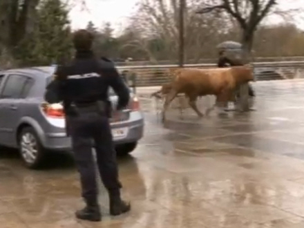 Et stort dyr på 280 kg. var sluppet ud fra det lokale slagteri og forsøgte nu at 'liste' sig tilbage til friheden. Tyren kom spadserende midt på gaden, men det er vanskeligt at falde i et med omgivelserne, når man er kæmpe-stor og har både hår og horn. Tyren fik ikke mange minutter på fri fod, før den blev opdaget af forbipasserende, der med det samme tilkaldte politiet.