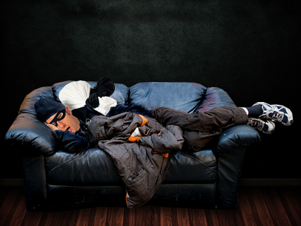 Man skal nu nok være meget træt og sløv – og meget fuld - hvis man falder i søvn på sofaen under et indbrud.