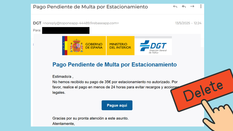 Svindleren her jokker i spinaten på flere måder. Godt nok er der smidt nogle officielt-udseende logoer in, men alene afsenderen 'noreply@toponeapp-44489.firebaseapp.com' skriger ikke ligefrem noget officielt DGT, der er Trafikstyrelsen, som man vil høre fra, hvis man har fået en bøde. Altid tjek afsenderen, og hvis det - som her - er noget helt underligt, kan du roligt trykke 'slet'.