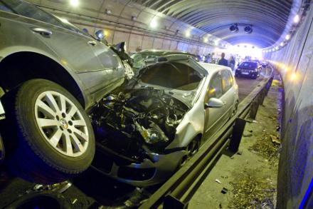 Mindst ti biler blev involveret i et gigantisk harmonikasammenstød, som bredte sig bagud til de øvrige bilister, som var på vej gennem tunnellen.