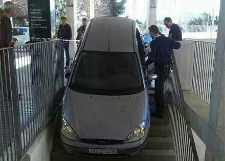 På trappen ned til sygehusets parkeringshus holdt nemlig en grå Ford Focus og spærrede for nedgangen.