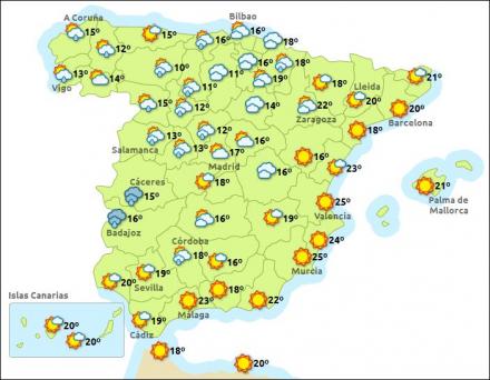 I morgen kommer der flere fronter ind fra Atlanterhavet, som giver mere skyet og koldere vejr. Temperaturen falder i hele landet, med undtagelse af det østlige Andalusien, Murcia og den sydlige del af Valencia regionen.