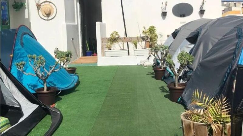 "Genoplad dine batterier i denne vidunderlige urbane campingbolig" lyder annoncen på platformen, der tilbyder "private værelser i telte" til en pris på 15 euro pr. nat i Lanzarotes hovedstad, Arrecife.