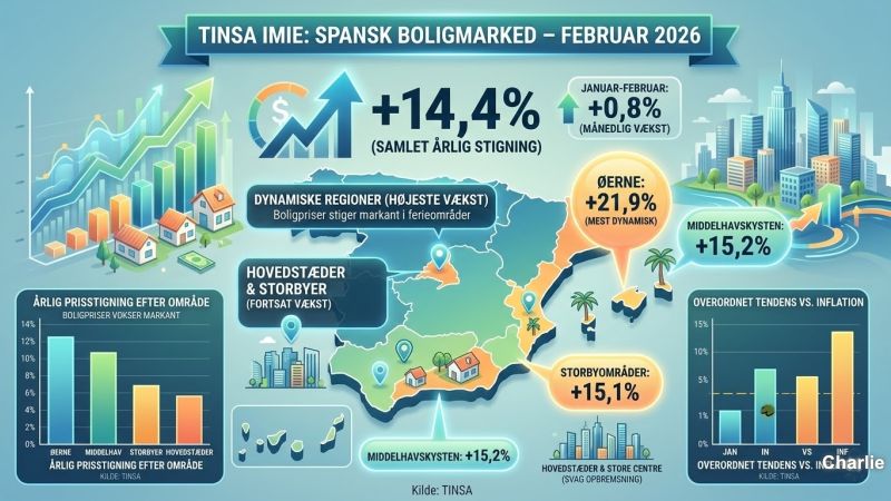 De nyeste tal fra Tinsa viser, at priserne på nye og brugte boliger i Spanien steg med 14,4 % i februar sammenlignet med samme måned sidste år. Alene fra januar til februar steg priserne med 0,8 %, hvilket vidner om et marked i højt gear, der nu vokser næsten 12 procentpoint hurtigere end den generelle inflation (+11,8 %).