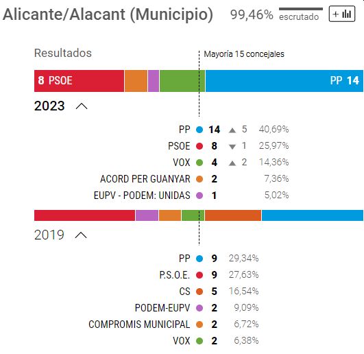 Også i Alicante Kommune går PP stærkt frem. Partiet mangler dog én plads for at få absolut flertal.