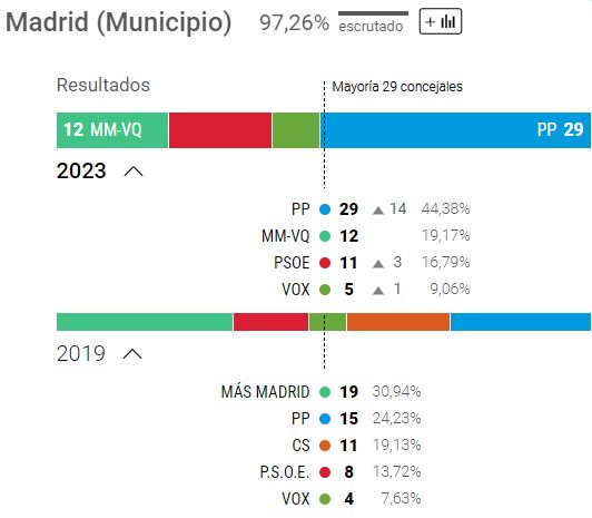 Også i Madrid Kommune er PP styrtet frem og opnår lige nøjgtigt et absolut flertal med 29 pladser.