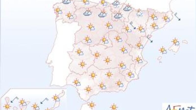 Hele landet går i dag stort set tørt og ret solrigt vejr, lige med undtagelse af den nordlige del af Baskerlandet, som får skyet vejr og mulighe...