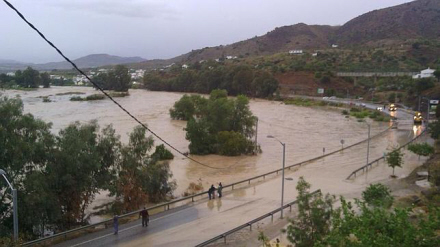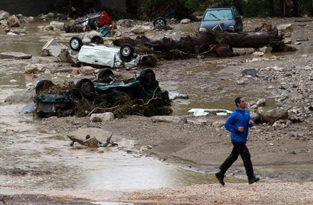En mand løber ned ad en gade i byen Villanueva del Rosario; en af de regnramte kommuner, hvor vandet har fejet flere køretøjer af vejen.