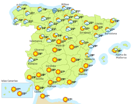 Vejret i Spanien, søndag klokken 15