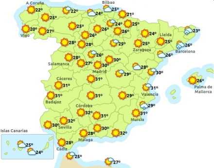 På Mallorca og de andre Baleariske Øer bliver det ret skyet vejr, og der kan også komme regn. Mellem 22 og 28 grader. I løbet af eftermiddagen efterhånden opklaring. I morgen letskyet med mulighed for lidt regn og mellem 20 og 31 grader. Mandag klart og solrigt med op til 32 grader, tirsdag bliver det endnu varmere med helt op til 35 grader, men så falder temperaturen igen. Fra fredag bliver det igen mere skyet, og i weekenden bliver det mellem 23 og 30 grader.