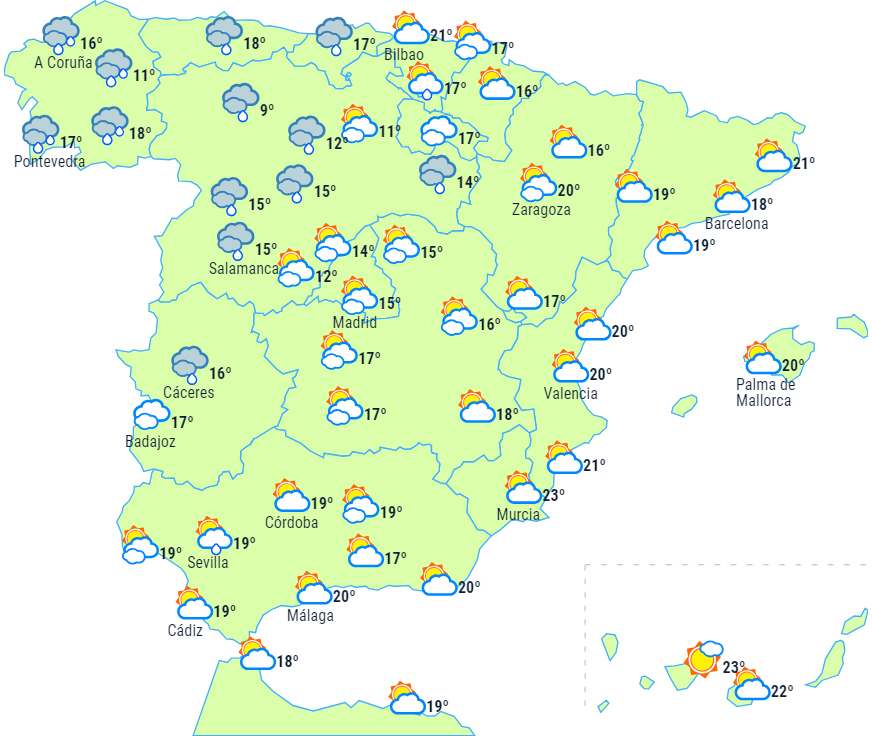 Skyet eller overskyet i starten af dagen på Atlanterhavssiden af halvøen med sandsynlighed for let nedbør, noget kraftigere i Galicien, men efterhånden tendens til opholdsvejr, som dagen skrider frem.