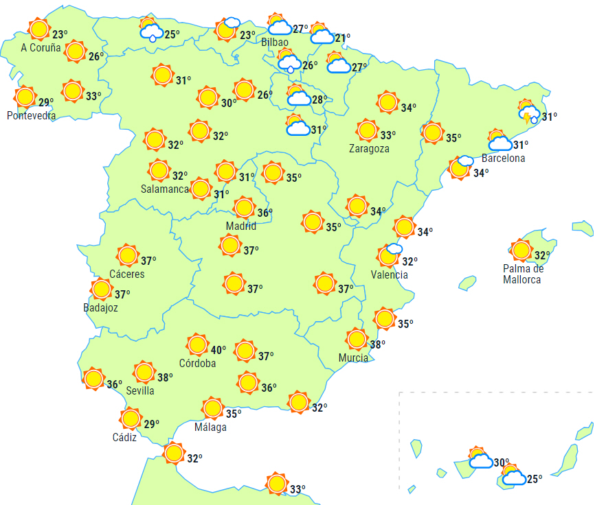 Temperaturerne vil overstige 34 grader i de sydlige områder af De Kanariske Øer, 36 grader i indlandsområderne på den sydlige halvdel og nordøstlige del af fastlandet og på Balearerne. Det er endda sandsynligt, at vi når 40 grader på den sydlige tredjedel af indlandet og i de nordøstlige dale.