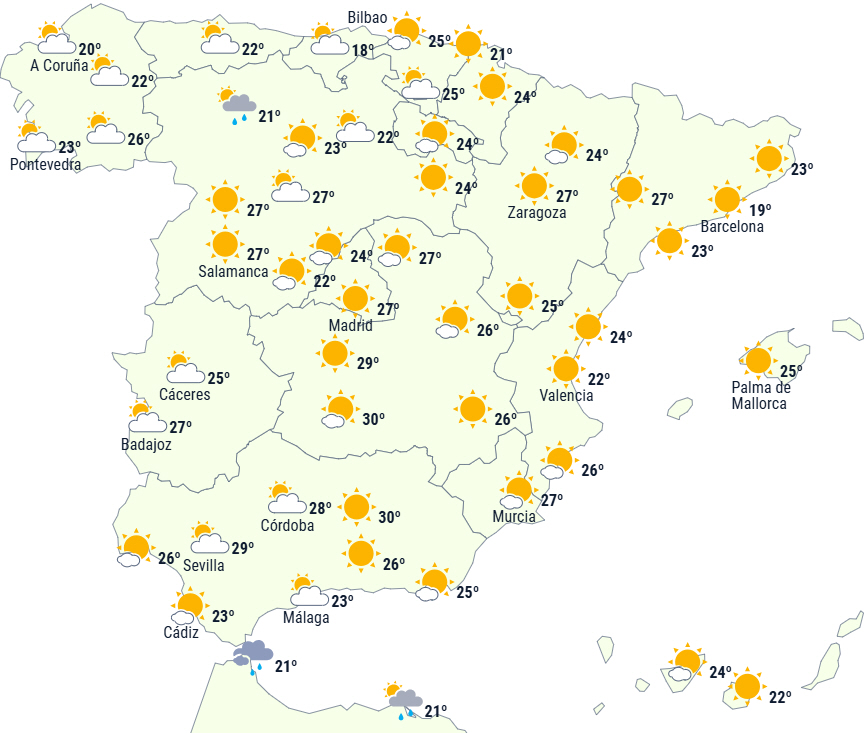 Der forventes højtliggende skyer over den nordvestlige del af Den Iberiske Halvø, som gradvis vil forsvinde, så det klarer op, dog med enkelte lavthængende skyer, især i de centrale og sidste timer af dagen.