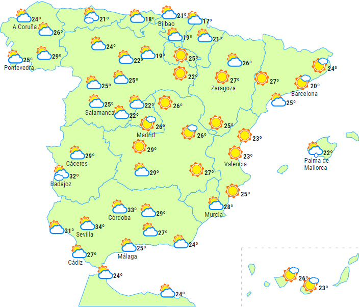 Skyet i Pyrenæerne og på den cantabriske kyst med let regn, som lokalt kan være vedvarende, men som vil aftage vestfra. I den nordøstlige del af Catalonien og på Mallorca og Menorca kommer der som nævnt byger, som kan ledsages af tordenvejr.
