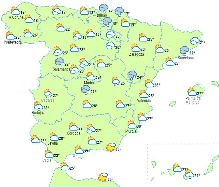 Spredte byger er heller ikke udelukket i andre dele af landet, undtagen i Galicien, det nordlige Castilla y León og Alborán, hvor det skulle holde tørt.