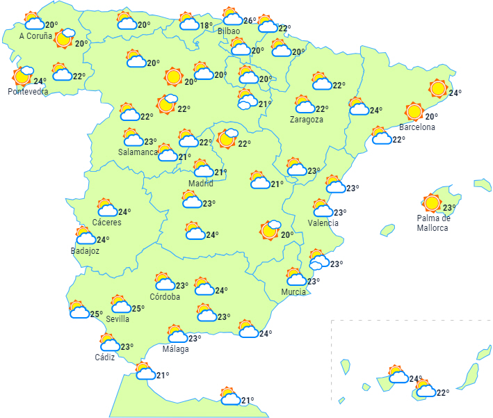 Der forventes stabilt vejr i hele landet med overvejende klar himmel eller med lidt højtliggende skyer, og i perioder mellemliggende skyer over De Kanariske Øer, samt efterhånden tiltagende skydække over bjergene og ved Gibraltarstrædet.