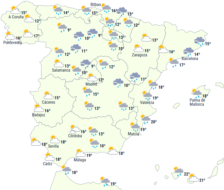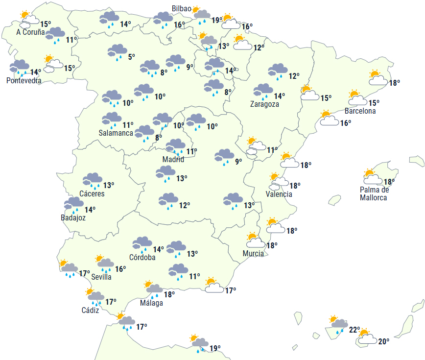 Spredt nedbør kan ledsages af tordenvejr og hagl på den sydvestlige del af halvøen og i det sydøstlige Andalusien.