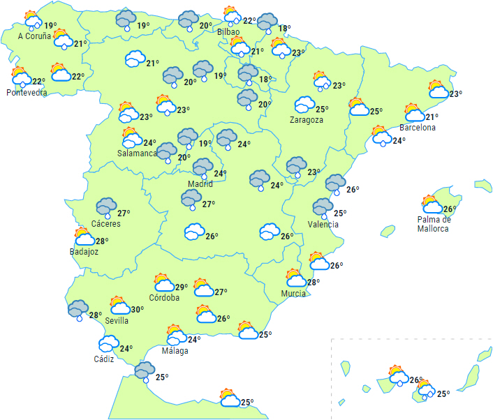 Der vil i løbet af eftermiddagen komme spredte byger til især bjergområderne, som af og til bliver ledsaget af tordenbyger, der lokalt kan være kraftige i det østlige Andalusien, Murcia, Valencia, det østlige Castilla-La Mancha og de sydlige af De Iberiske Randbjerge.