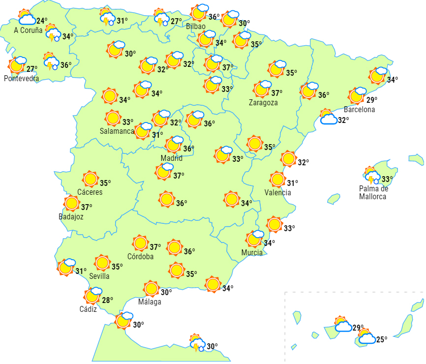 Letskyet eller klart i begyndelsen af dagen i resten af landet, men med mere overskyet i løbet af dagtimerne over den nordlige halvdel og den østlige tredjedel af halvøen. Sandsynlighed for byger og tordenvejr i det indre af Galicien, i Cantabrien og i de centrale og østlige Pyrenæer og måske i de omkringliggende områder.