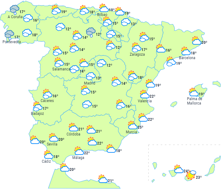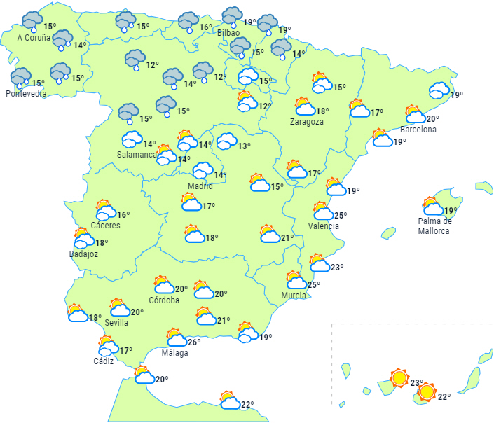På resten af halvøen og De Baleariske Øer vil et højtryk give mere stabilt vejr uden nedbør, men dog med perioder med højtliggende skyer og rigeligt med lavthængende skyer i Atlanterhavsområderne med undtagelse af Andalusien, dalene i det nordøstlige af fastlandet og det indre af Mallorca.