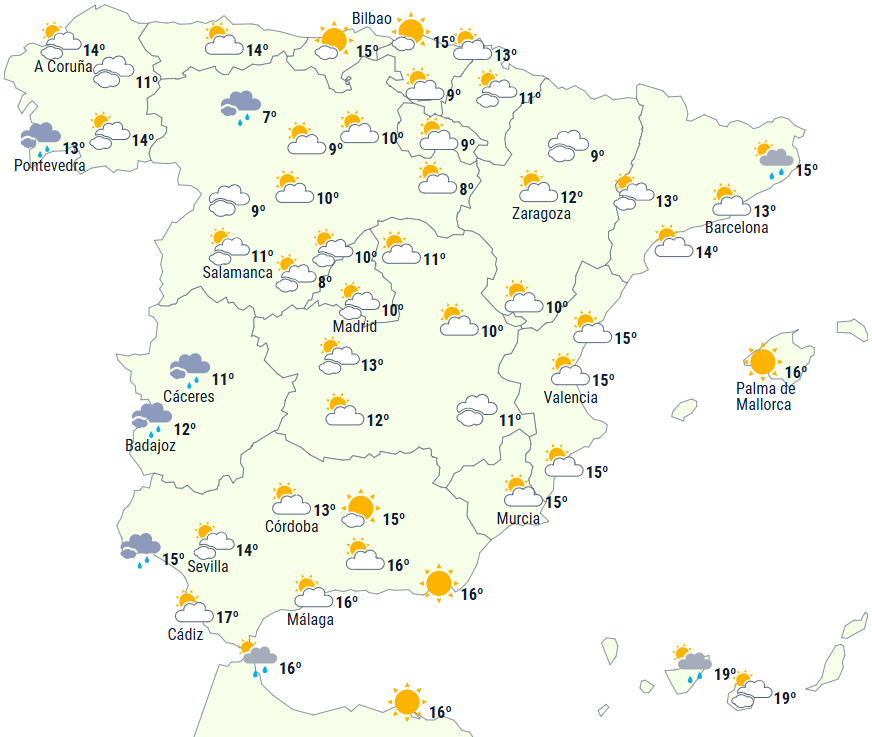 Minimumstemperaturerne vil stige i det sydvestlige og nordøstlige hjørne, på Balearerne og på de vestlige af De Kanariske Øer, mens der ikke forventes ændringer i resten af landet.