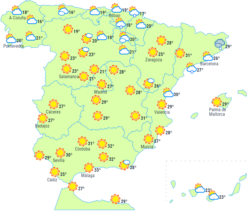 Temperaturerne forventes at overstige 35 grader på den sydlige og nordøstlige del af halvøen, i de indre egne af Mallorca og i de centrale dele i det sydlige af De Kanariske Øer. Vi kan endda ramme 38 til 40 grader i dele af Andalusien, Murcia, det sydlige Valencia, Albacete og de nordøstlige dale.