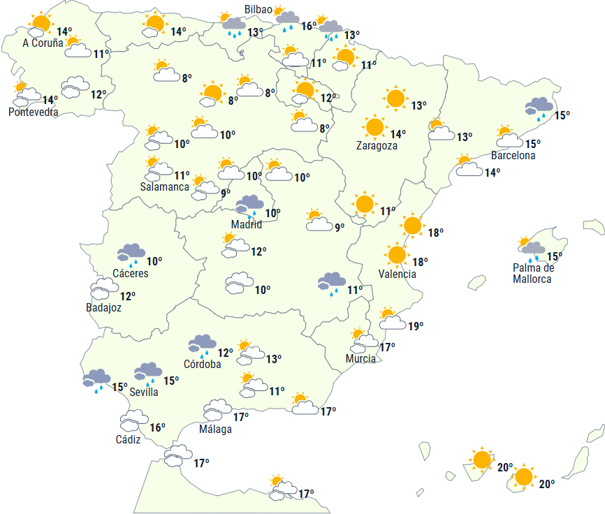 Dagstemperaturerne vil stige på den atlantiske side, ved Middelhavskysten og på De Baleariske Øer, mens de vil falde i Cantabrien.