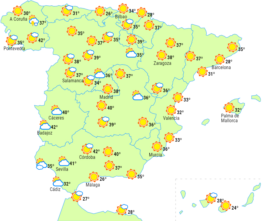 Igen en dag med varsler om meget høje temperaturer på det meste af halvøen og Mallorca, med bemærkelsesværdige stigninger i det vestlige Galicien og fald på De Kanariske Øer.