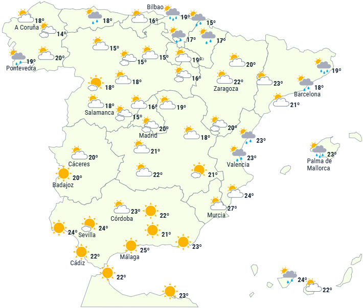 Kun på den nordvestlige del af halvøen forudses skyet himmel med tendens til at blive mere overskyet i løbet af dagen på grund af nærmelsen af en front. Den bringer også nedbør og lejlighedsvise tordenvejr til den nordvestlige tredjedel af halvøen, som lokalt kan være ret potente i den vestlige del af Galicien.