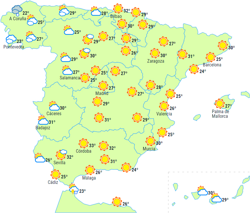 Nattemperaturerne sker der ikke det store med bortset fra et lille fald på De Kanariske Øer. Dagstemperaturerne vil falde på De Kanariske Øer, Ampurdán og de cantabriske kyster, mens de vil stige i den vestlige del af Galicien og i de indre områder i den sydøstlige del af halvøen. Små ændringer andre steder. Temperaturerne vil forblive i den lune ende i forhold til årstiden i det meste af landet, men især på den helt nordlige del af halvøen og på De Kanariske Øer, hvor de kan ramme 33 til 35 grader på den sydlige del af øerne.