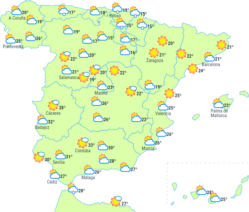 Tiltagende skydække i takt med passagen af fronten på resten af den nordlige halvdel, hvor der ikke kan udelukkes noget let nedbør, dog mere sandsynligt i bjergene. Skyet eller overskyet himmel vil også være fremherskende over den nordlige halvdel af Middelhavsområdet med lejlighedsvise byger og tordenvejr på Mallorca, Menorca og det østlige Catalonien, og vi kan som nævnt ikke udelukke kraftige byger på den catalanske kyst og de nordlige dele af øerne, og i de tidlige timer kan vi endda lokalt få kraftige byger på Valencias kyst.