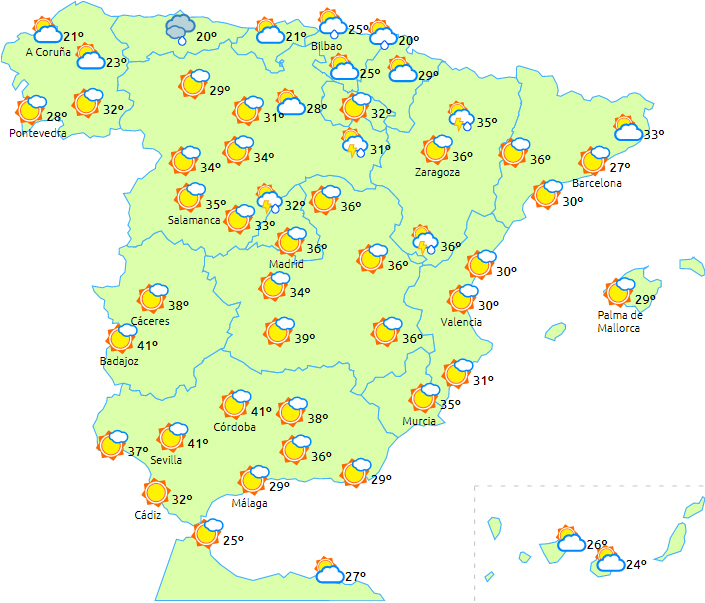 Overskyet himmel med enkelte lette byger over Galicien og i områderne langs nordvestkysten. Lavt skydække i begyndelsen af dagen, som bliver afløst af perioder med højtliggende skyer på resten af halvøen og Balearerne, og efterhånden mere skyet i nord, centrum og bjergene på den sydøstlige del af halvøen. Her kan vi ikke udelukke enkelte regn- og tordenbyger i bjergområderne. Periodevise overskyet over de nordlige dele af De Kanariske Øer og letskyet eller klart over de sydlige dele.