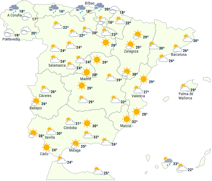 Dagstemperaturerne stiger let i centrum af halvøen og moderat i sydvest, uden væsentlige ændringer i øvrigt. Temperaturer på 34 til 36 grader forventes i lavlandsområder i Andalusien og på det nordøstlige af halvøen samt andre steder i sydøst og i indlandet på Mallorca.
