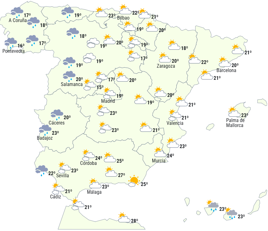 Dagstemperaturerne er i let stigning i dalene i nordøst og ved Middelhavskysten, mere udtalt i Melilla, hvor man overstiger 30 grader. De vil til gengæld falde på De Kanariske Øer, i det centrale nord og i indlandsområder af den sydlige halvdel af fastlandet - lokalt bemærkelsesværdige fald i det sydlige højland og Andalusien. Få ændringer i resten.