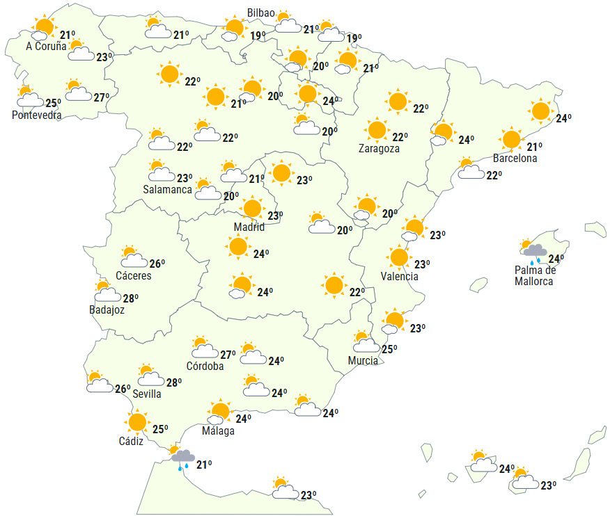 I de tidlige morgentimer kan byger og tordenvejr, som lokalt er kraftige, fortsætte på de cataloniske kyster. Ligeledes, dog med en vis usikkerhedsmargin med hensyn til lokalisation, forventes fra de tidlige timer let til overskyet himmel over store dele af indlandet med byger ledsaget af torden i det centrale-sydlige og centrale-østlige og bjergområder generelt.
