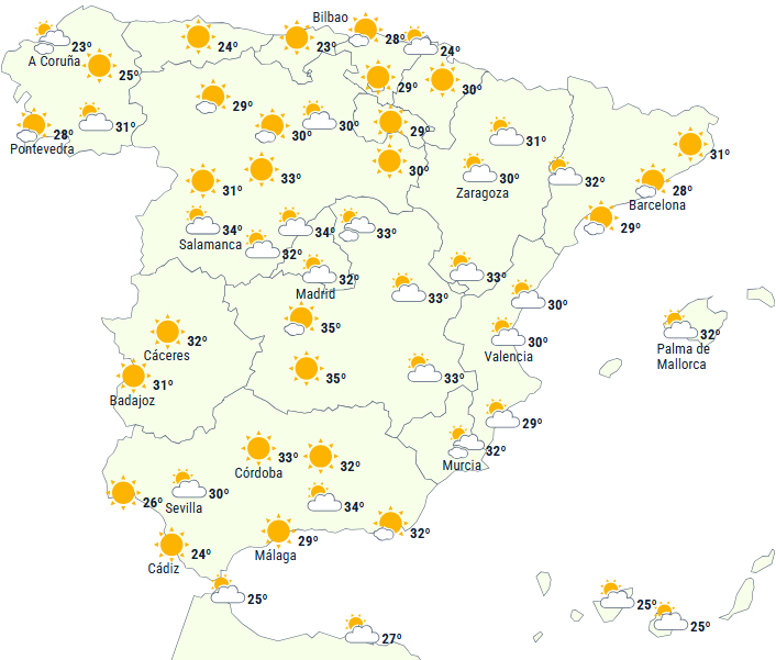 Temperaturen vil overstige 35 grader på størstedelen af den sydlige halvdel af Den Iberiske Halvø, i højlandet i nord, i den sydlige del af Galicien, i de nordøstlige dale samt på dele af De Kanariske Øer og De Baleariske Øer. Op til 40 grader i dalene på den sydlige atlantiske side.