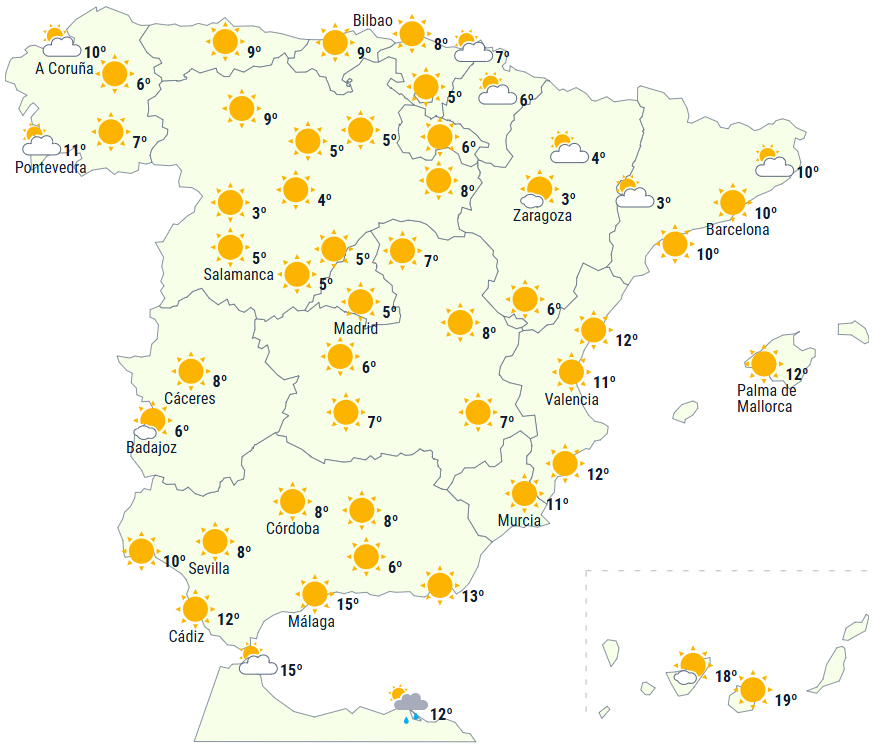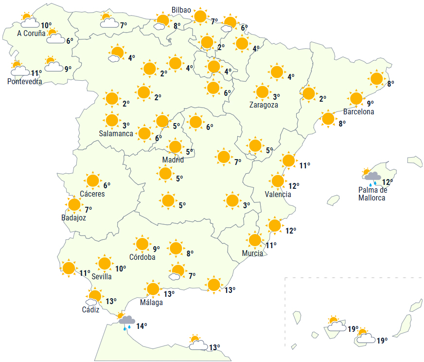 Moderat til lokalt kraftig frost på den nordøstlige del af halvøen, i det indre Andalusien, i højlandet og i de omkringliggende bjerge. Det var dog begge Castillaerne og Catalonien, der oplevede de koldeste morgener med mellem 12 og 11 minusgrader.