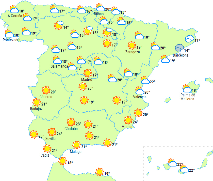 Overskyet over den nordlige del af halvøen med nedbør ved nordvestkysten og i Pyrenæerne, og også lidt svagere regn i Galicien, men her hører det op i løbet af dagen.