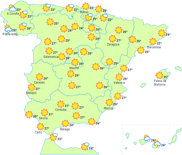 Dagstemperaturerne vil stige næsten over hele linjen, men mere markant på den østlige halvdel af halvøen, mens der sker små ændringer eller lette fald i det vestlige Galicien. Nattemperaturerne vil stige på det meste af den nordlige halvdel af halvøen og falde i Andalusien og på sydøstkysten. Kun få ændringer i resten.