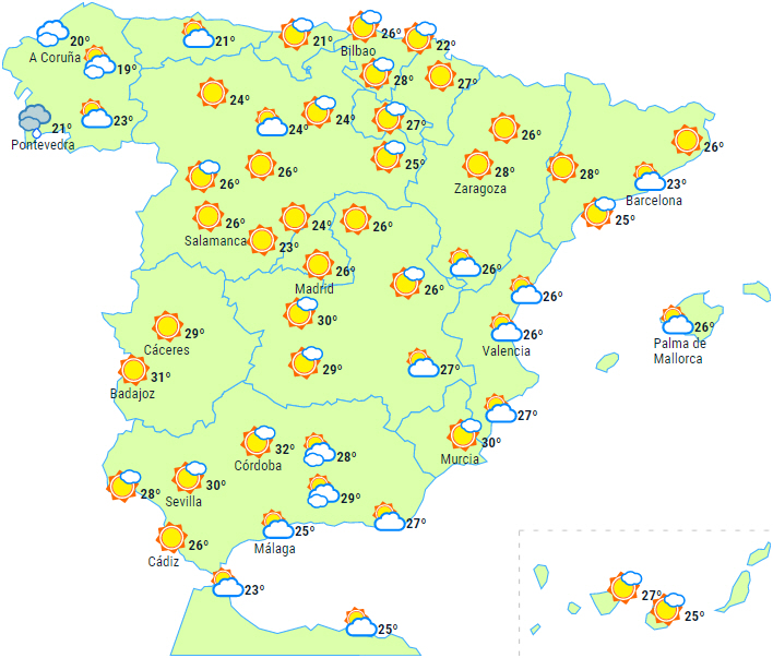 Letskyet til klart vejr til det meste af halvøen. På De Kanariske Øer forventes der dog overskyet vejr over de nordlige dele med lokalt vedvarende regn i højtliggende egne og overskyet i perioder over de sydlige dele.