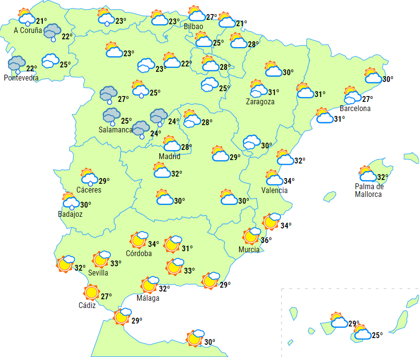 I begyndelsen af dagen også overskyet himmel over den østlige tredjedel af halvøen med byger og torden, som lokalt kan være kraftige i Pyrenæerne og i den helt sydøstlige del, men dog tendens til aftagende nedbør og skydække i løbet af dagen.