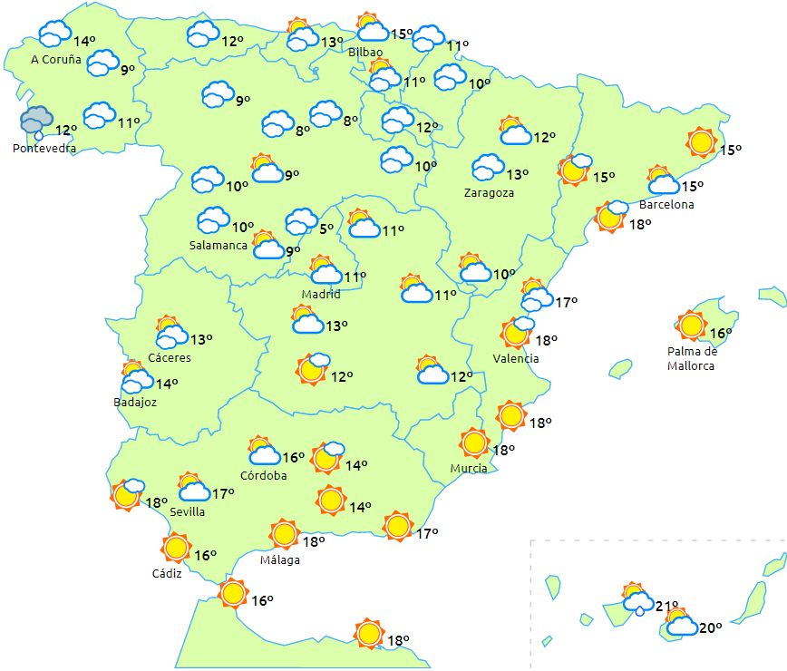 Dagstemperaturerne vil stige på Atlanterhavssiden, mens der kun vil være små ændringer eller lette fald i Middelhavsområdet. Nattemperaturerne vil falde næsten overalt på halvøen og Balearerne med frost til det nordlige højland, det østlige af det sydlige højland, i de iberiske og centrale bjerge, i bjergområderne i den sydøstlige del af halvøen og koldest i Pyrenæerne.