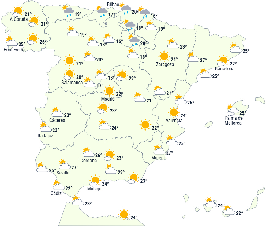 Der vil overvejende være skyet eller helt overskyet himmel, og nedbør er forventet næsten overalt, bortset fra i det lavere Ebro-område, hvor det er usandsynligt, samt i den sydvestlige del, helt i sydøst og langs den vestlige galiciske kyst, hvor der ikke ventes nogen nævneværdig nedbør.