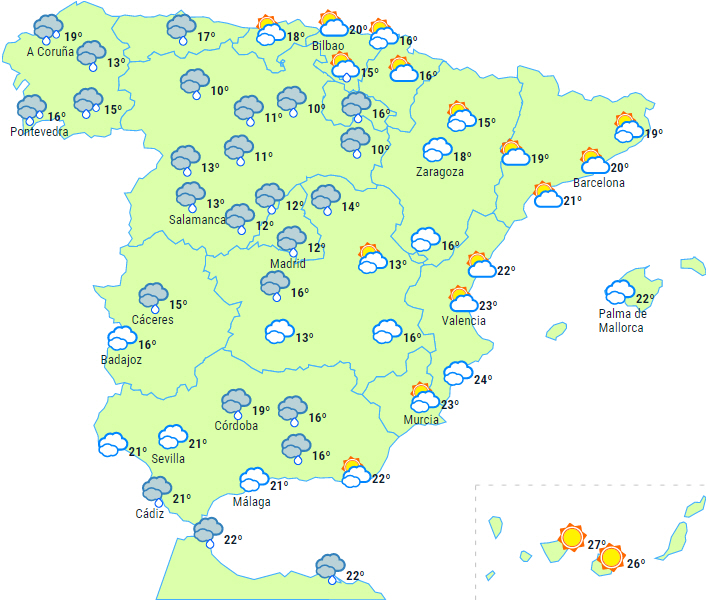 Nedbøren vil være vedvarende og lokalt kraftig i den vestlige del af Galicien i løbet af dagens første halvdel. Der kan også være en vis persistens i området omkring de vestlige af de centrale bjerge og de vestlige Pyrenæer.